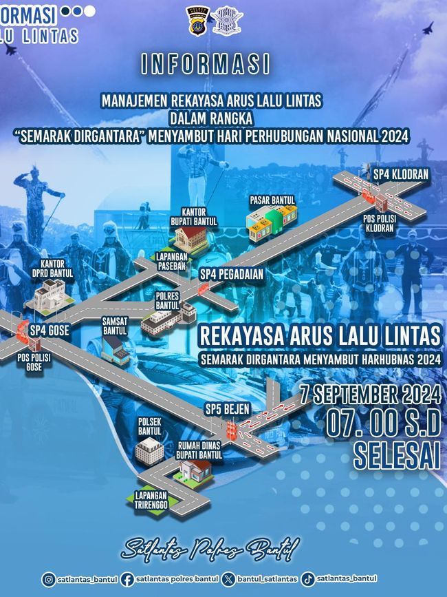 Polres Bantul kembali melakukan rekayasa lalu lintas (Lalin) besok pagi di sekitar Alun-alun Paseban, Bantul. Pasalnya akan ada kirab drumband dari AAU (Akademi Angkatan Udara) dalam rangka 'Semarak Dirgantara' menyambut hari perhubungan nasional.