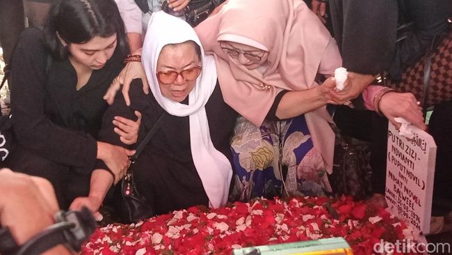 Sang ibunda, Susi, tak kuasa menahan tangis ketika tanah perlahan menutupi jenazah putrinya itu di liang lahad. Tampak keluarga dan sahabat-sahabat almarhumah turut mengikuti prosesi pemakaman.