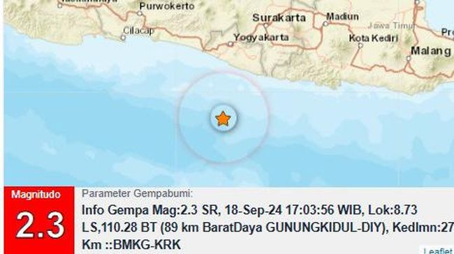 Gempa bumi berkekuatan magnitudo (M) 2,3 terjadi di Kabupaten Gunungkidul, Daerah Istimewa Yogyakkarta (DIY), sore ini. Pusat gempa di perairan.