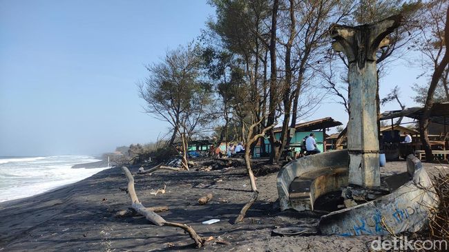 Dari pantauan detikJogja, terlihat bangku dan meja taman yang terbuat dari beton di tepi pantai telah rusak. Beberapa warung semi permanen juga sudah ambruk, tinggal menyisakan puing-puingnya saja.