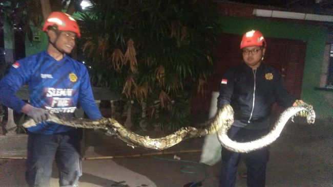 Ular sanca kembang sepanjang 4 meter berhasil dievakuasi Damkar Sleman. Ular itu diketahui bersembunyi di gorong-gorong masjid di Purwomartani, Kalasan, Sleman.