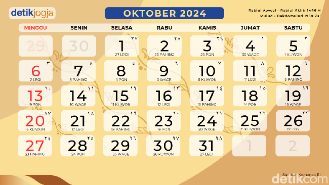 Oleh karena itu, memasuki bulan ke-10 dalam penanggalan Masehi, kalender bulan Oktober 2024 pun banyak dicari. Bagi detikers yang membutuhkan informasi tentangnya, berikut ada kalender bulan Oktober 2024 yang sudah disiapkan detikJogja dan dapat dijadikan sebagai panduan.