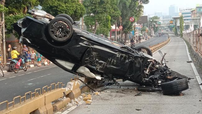 Setelah menabrak separator, mobil itu diduga terhempas hingga terbalik. Dari foto yang diterima, tampak airbag mengembang dan bagian sisi kiri BMW itu hancur hingga roda depan kirinya terlepas.