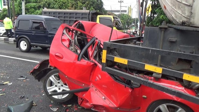 Akibatnya, mobil berwarna merah itu terdorong ke depan dan menabrak truk tangki gas. Mobil Peugeot itu pun ringsek parah.