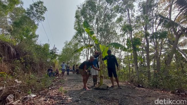Peserta aksi juga menanam sebuah pohon pisang tepat di tengah Jalan Gayam. Sebelumnya warga juga sudah memasang sejumlah spanduk yang berisi keluh kesah terkait kerusakan jalan tersebut.