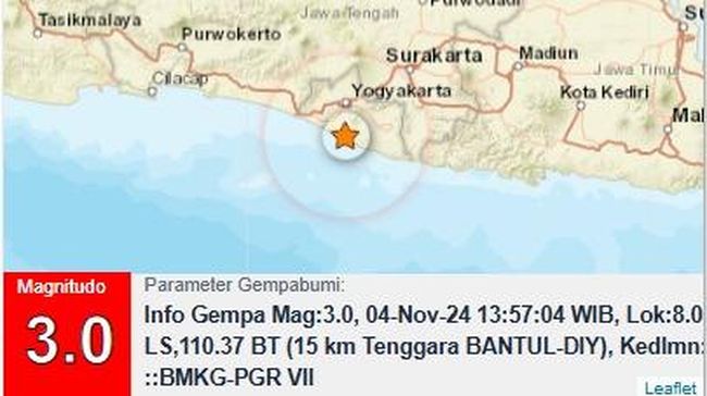 "Info Gempa Mag:3.0, 04-Nov-24," kata Badan Meteorologi, Klimatologi, dan Geofisika (BMKG) DIY dalam keterangan tertulisnya, Senin (4/11/2024).