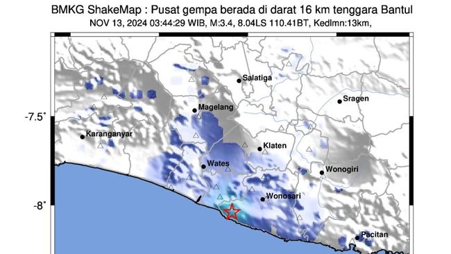 "Hari Rabu tanggal 13 November 2024 pukul 03.44.29 WIB wilayah Bantul, DIY dan sekitarnya diguncang gempabumi tektonik. Hasil analisis BMKG menunjukkan gempabumi ini memiliki parameter dengan magnitudo 3,4," kata Plt Kepala Stasiun Geofisika BMKG DIY Wawan Joko Suwondo dalam keterangan tertulisnya, Rabu (13/11/2024) pagi.