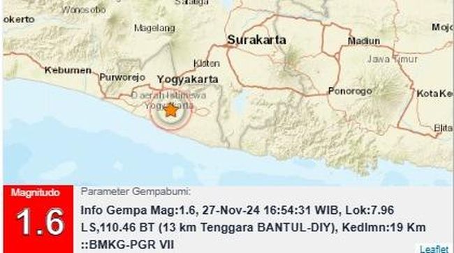 Gempa bumi berkekuatan magnitudo 1,6 terjadi di Bantul, Daerah Istimewa Yogyakarta (DIY). Gempa ini berpusat di darat.