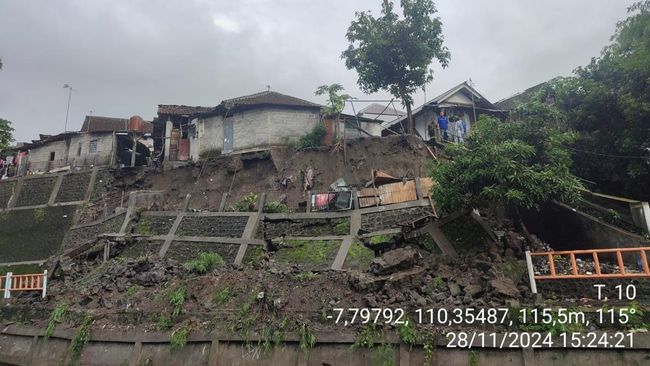Sebidang talut di bantaran Kali Winongo, Ngampilan, Kota Jogja, longsor akibat cuaca buruk yang melanda sejak Kamis (28/11) pagi. Badan Penanggulangan Bencana Daerah (BPDB) Kota Jogja mengonfirmasi tak ada korban jiwa atau luka dalam kejadian ini.