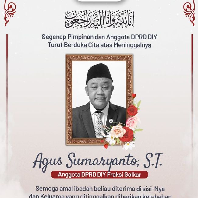"Segenap Pimpinan, Anggota, dan Sekretariat DPRD Daerah Istimewa Yogyakarta turut berduka cita atas berpulangnya Bapak Agus Sumaryanto, S.T. (Anggota DPRD DIY - Fraksi Golkar). Semoga amal ibadah beliau diterima di sisi-Nya, dan keluarga yang ditinggalkan diberikan ketabahan," tulis akun tersebut seperti dilihat detikJogja pagi ini.