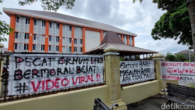 Pantauan detikJogja, tampak beberapa spanduk terpasang di pagar depan Kantor DPRD Gunungkidul. Spanduk-spanduk itu bertuliskan 'Dewan keluarkan ANU!! VCS Gunungkidul malu', 'pecat oknum DPRD bermoral bejat #videoviral!!', 'Gedung baru masalah baru apa tidak malu' hingga 'Oknum dewan mikir G*W*K!! Gunungkidul remuk'.