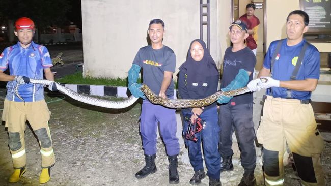 Seekor ular piton sepanjang 4 meter dievakuasi di Luwu Timur, Sulawesi Selatan (Sulsel). Hewan itu dibawa setelah melilit ayam yang berada di dalam kandang halaman salah satu polsek.