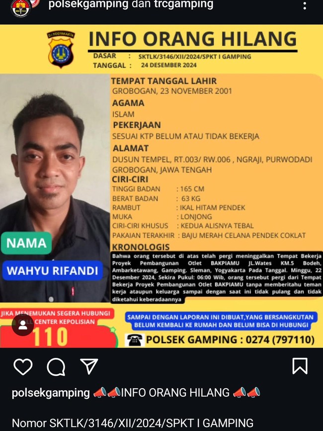 "Benar kami menerbitkan info orang hilang atas nama Wahyu Rifandi warga Purwodadi, Grobogan, Jawa Tengah. Tapi barusan dapat info dari personel SPKT Polsek Gamping, sudah pulang ke rumah di Grobogan," jelasnya saat dihubungi melalui sambungan telepon, Selasa (24/12/2024).