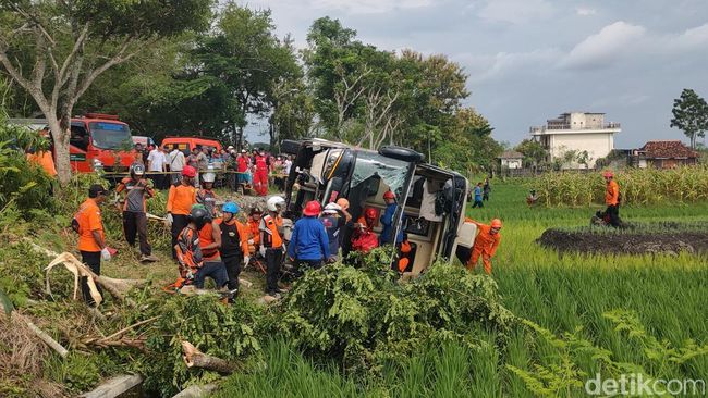 Adapun dari pantauan detikJogja, proses evakuasi kendaraan yang dilakukan oleh SAR gabungan resmi berakhir pada pukul 17.05 WIB. Bangkai bus yang semula terjebak di persawahan berhasil diangkat menggunakan tali yang ditarik kendaraan jip milik Sedulur Rescue Yogyakarta.