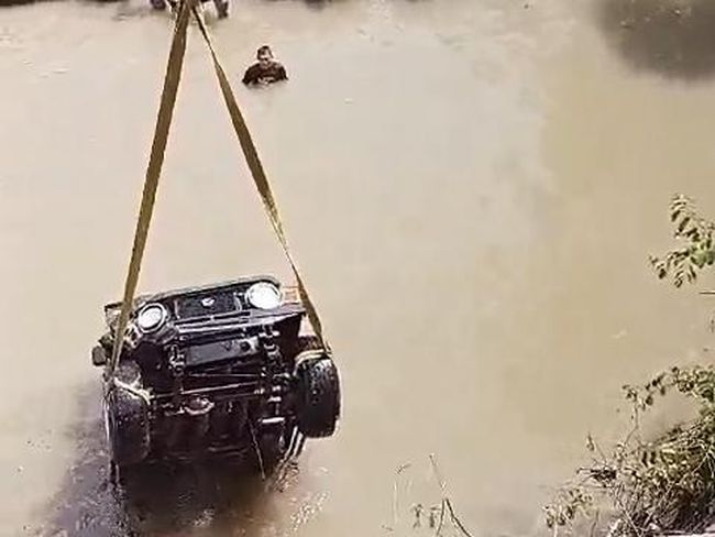 Satu unit mobil tercebur sungai di Karangploso, Sitimulyo, Kapanewon Piyungan, Bantul, saat ditinggal sopir yang akan buang air besar (BAB). Begini detik-detik mobil jenis jip itu jalan sendiri dan nyemplung ke sungai.