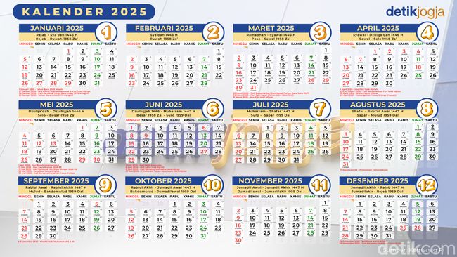 Sebelum membahas mengenai peringatan pentingnya, mari kita lihat kalender hari ini, detikers. Berdasarkan Kalender Hijriah Indonesia Tahun 2025 yang dirilis Ditjen Bimbingan Masyarakat Islam Kementerian Agama RI, 14 Januari 2025 adalah hari Selasa yang memiliki pasaran Legi menurut kalender Jawa serta bertanggal 14 Rejeb 1958 (Za'). Kemudian menurut kalender Hijriah, hari ini bertepatan dengan 14 Rajab 1446 H.