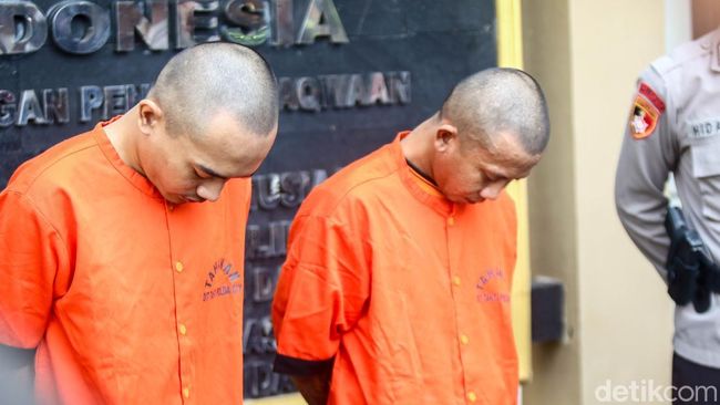 Kedua tersangka digiring dua petugas menuju ke lokasi jumpa pers. Mereka tidak menggunakan sebo atau penutup wajah dan rambut keduanya telah dicukur.