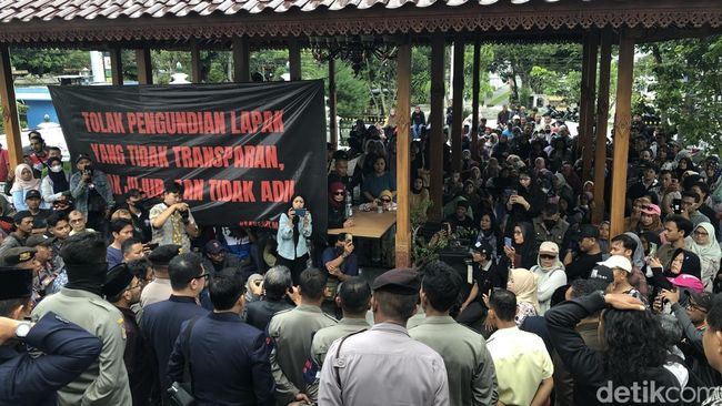 Pantauan detikJogja, ratusan pedagang tiba di gedung DPRD Jogja sekitar pukul 14.00 WIB. Mereka membentangkan spanduk, meneriakkan tuntutan, hingga membawa nisan bertulis 'Kematian Keadilan'.