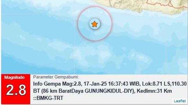 "Info Gempa Mag:2,8, 17-Jan-25," kata Badan Meteorologi, Klimatologi, dan Geofisika (BMKG) DIY dalam keterangan tertulisnya, Jumat (17/1/2025).