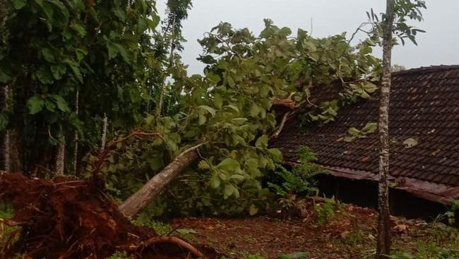 Hujan deras disertai angin kencang membuat puluhan pohon tumbang di Kabupaten Gunungkidul, sore ini. Dua rumah warga dilaporkan mengalami kerusakan pada atap akibat cuaca ekstrem ini.