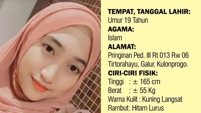 Wanita muda ini terakhir terlihat mengenakan celana hitam, jaket jeans biru, jilbab hitam, memakai kacamata, menggunakan sepatu biru tosca dan tas gendong hitam. Dia mengendarai sepeda motor Supra X 125 bernomor polisi AB 2391 DP.