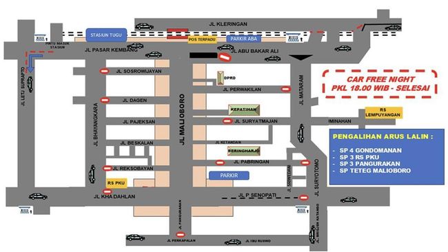 Tak hanya itu, beberapa ruas jalan di sirip-sirip Malioboro juga akan ditutup. Di antaranya Jalan Sosrowijayan, Dagen, Reksobayan, Perwakilan, Suryatmajan, serta Pabringan.