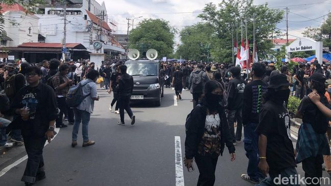 Pantauan detikJogja, massa mulai tiba di depan Gedung Agung sekitar pukul 13.30 WIB. Mayoritas massa kemudian memadati jalur pedestrian untuk duduk-duduk beristirahat.
