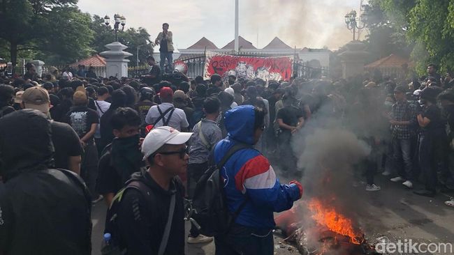 Sementara itu, sejumlah orang juga tampak melempari area Gedung Agung Jogja dengan botol. Polisi yang berjaga di lokasi pun langsung merapat ke depan gerbang Gedung Agung.