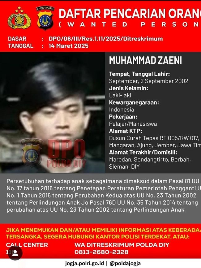 Seorang pria bernama Muhammad Zaeni (23) masuk dalam Daftar Pencarian Orang (DPO) Polda DIY (Daerah Istimewa Yogyakarta) atas tindak pidana persetubuhan dengan anak. Berikut ciri-cirinya.