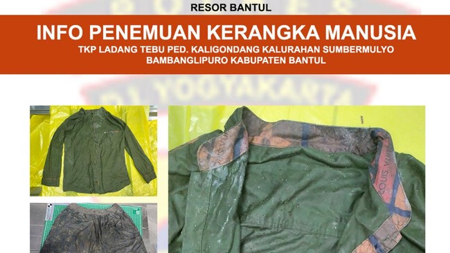 "Sampai saat ini belum ada yang lapor ke Polres Bantul. Kalau ada anggota keluarganya hilang dan pakaiannya baju lengan panjang warna hijau dengan kerah baju terdapat tulisan Louis Vuitton dan celana pendek warna hitam motif garis segitiga silakan langsung ke Polres Bantul," ujarnya.