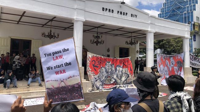 Ratusan massa yang mengatasnamakan diri Aliansi Jogja Memanggil menggeruduk Gedung DPRD DIY, Malioboro, siang ini. Aksi mereka kali ini menyoroti dampak yang akan muncul usai disahkannya Undang-undang TNI hari ini.
