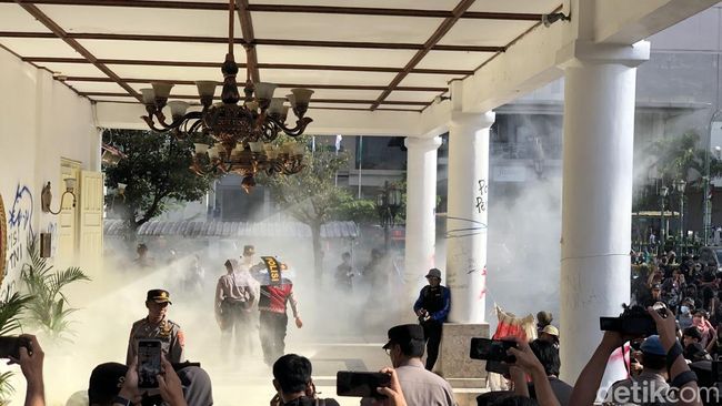 Massa kemudian melakukan aksi corat-coret di gedung DPRD DIY dan mulai membakar sampah di selasar gedung. Beberapa massa bahkan menyulut petasan berulang kali di selasar.