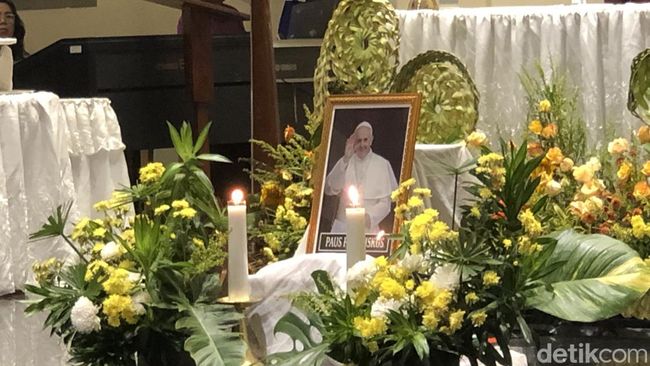 Pantauan detikJogja, Senin (21/4/2025), terlihat ada foto Paus Fransiskus yang dihiasi karangan bunga terpajang di dekat altar. Misa sore ini membawakan ujub doa bagi mendiang Paus Fransiskus.