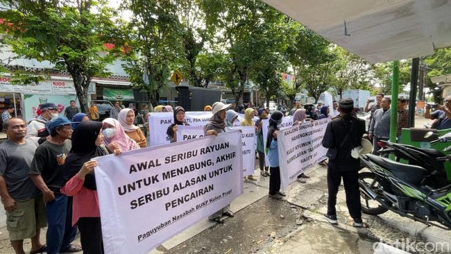 Pantauan detikJogja, terlihat massa telah memadati Kantor BUKP Wates yang berlokasi di depan Pasar Bendungan, Kalurahan Bendungan, Kapanewon Wates, Kulon Progo, sekitar pukul 09.15 WIB. Massa yang didominasi emak-emak ini berjalan kaki sembari membentangkan spanduk protes.