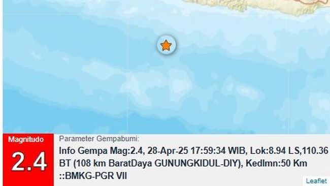 "Info Gempa Mag:2.4, 28-Apr-25," kata Badan Meteorologi, Klimatologi, dan Geofisika (BMKG) DIY dalam keterangan tertulisnya, Senin (28/4/2025).