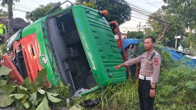 Namun sampai di lokasi kejadian, truk ini tiba-tiba mengalami oleng hingga keluar jalur. Akibatnya menabrak bangunan bekas sekolahan, lalu terguling di sekitar situ.