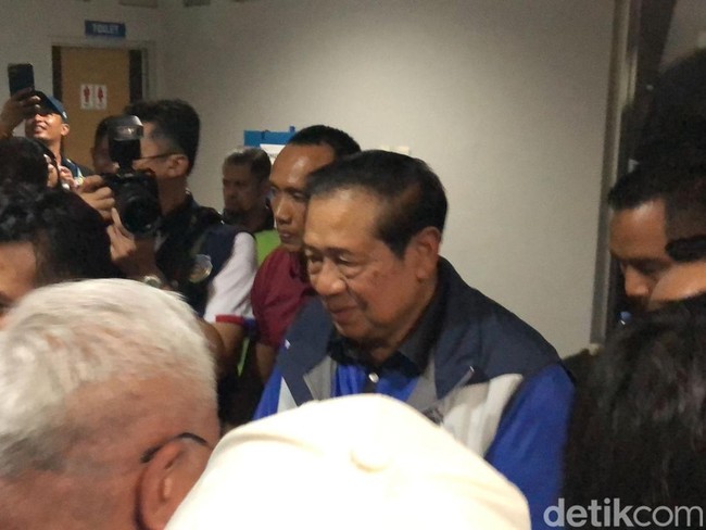 Pantauan detikJogja, SBY memasuki pintu VVIP GOR Among Rogo sekitar pukul 19.15 WIB. SBY masuk bersama putra keduanya, Edhie Baskoro Yudhoyono atau Ibas.