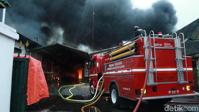 Pantauan detikJogja di lokasi kejadian pukul 06.14 WIB, api yang membakar pabrik masih belum bisa dipadamkan. Asap hitam pekat terus membumbung ke langit.