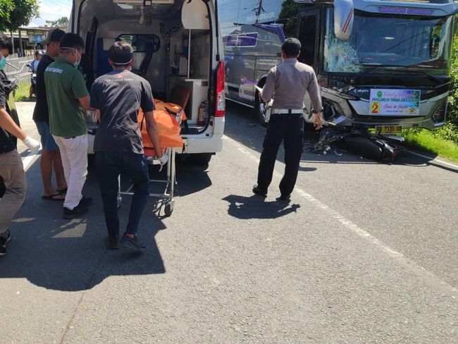 "Lalu dari timur ke selatan melaju motor dan tiba-tiba motor melambung ke kanan jalan dan menabrak bagian depan bus pariwisata," kata dia saat dihubungi wartawan, Kamis (29/5/2025).