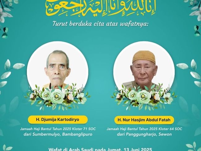"Hallo sedulur Bantul, Pemerintah Kabupaten Bantul turut berduka cita atas wafatnya dua jemaah haji asal Kabupaten Bantul, DIY di Tanah Suci. Kedua jemaah itu yakni Djumija Kartodiryo (80) berasal dari Kelompok Terbang (Kloter) SOC 071 dan Nur Hasjim Abdul Fatah Kloter 064 SOC. Keduanya meninggal dunia di hari yang sama, Jumat (13/6) lalu," tulis akun tersebut seperti dilihat detikJogja, malam ini.