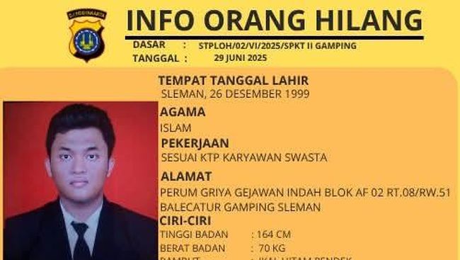 Keluarga kemudian melaporkan hal itu ke polisi pada Minggu (29/6). Laporan tersebut tertuang dalam Surat Tanda Penerimaan Laporan Orang Hilang (STPLOH) Nomor: STPLOH / 02 / VI / 2025 / SPKT Gamping, mengenai warga yang meninggalkan rumah dan belum diketahui keberadaannya.