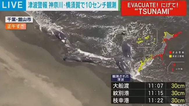 Terdamparnya paus-paus di area pantai ini terekam kamera setelah Badan Meteorologi Jepang (JMA) melaporkan gelombang tsunami setinggi 50 sentimeter menghantam area pelabuhan Ishinomaki, kota pelabuhan utama di Prefektur Miyagi di pesisir timur Jepang. Ini tercatat sebagai gelombang tertinggi sejauh ini.