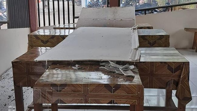 Dalam video yang diunggah nampak plafon dengan ukuran cukup besar menimpa beberapa meja yang ada di kantin. Alhasil, piring-piring yang berada di atas meja itu juga jadi pecah.