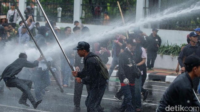 Massa sempat mendekat ke mobil pengurai massa. Tampak ada yang melempar barang ke arah polisi. Hal itu direspons polisi dengan menyemprot massa menggunakan water cannon.