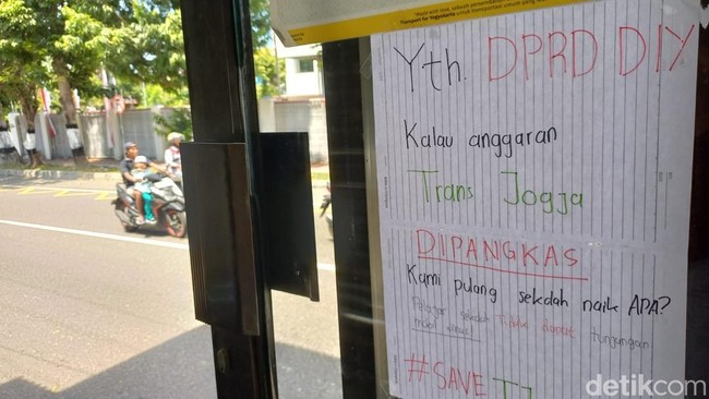 Sebuah foto yang memperlihatkan kertas bertuliskan keresahan soal pemangkasan anggaran Trans Jogja di halte Trans Jogja viral di media sosial. Kertas itu bertuliskan penolakan akan rencana pemangkasan anggaran Trans Jogja itu ditujukan untuk DPRD DIY. Begini penjelasan DPRD.