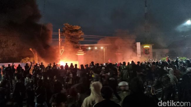 Pantauan detikJogja, Jumat (29/8/2025) pukul 19.13 WIB, tampak massa memadati depan pagar Polda DIY sisi barat, tepatnya di sekitar pos SPKT. Terlihat beberapa benda di depan pagar tersebut dibakar massa hingga menimbulkan suara keras.