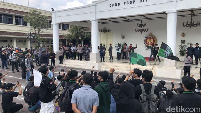 Pantauan detikJogja, Senin (1/9/2025), massa masuk ke halaman gedung DPRD DIY pukul 14.30 WIB. Mereka membawa atribut dan bendera berlambang HMI. Massa kemudian duduk dan bergantian berorasi.