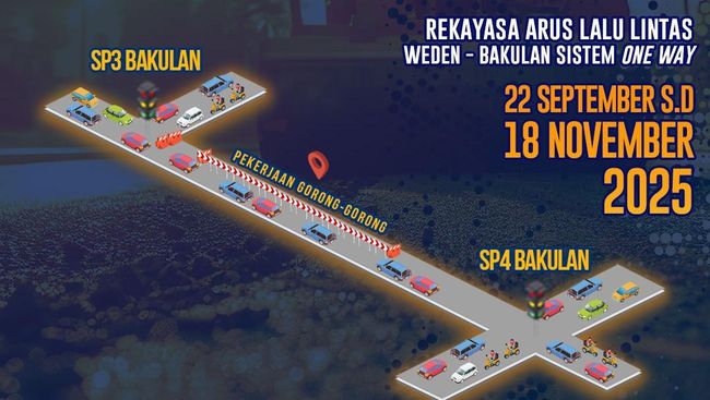 "Akan diberlakukan sistem one way di ruas Jalan Kweden-Bakulan, yakni kendaraan masuk dari arah timur (simpang empat Bakulan) menuju ke arah barat (simpang tiga Bakulan)," kata Kasi Humas Polres Bantul, Iptu Rita Hidayanto kepada wartawan, Senin (22/9/2025).