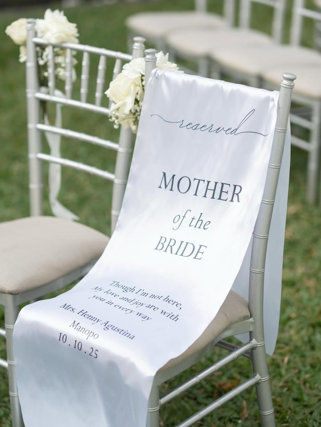Dilansir detikHOT Jumat (10/10/2025), di bangku berwarna putih itu, terdapat tulisan 'Mother of the Bride (Ibu dari Mempelai Wanita)'. Kemudian di bagian bawah bertuliskan 'Though I'm not here, my love and joy are with in every way. Mrs Henny Agustina Manopo (Meski aku tidak lagi di sini, cinta dan kebahagiaanku akan selalu ada sampai kapan pun. Nyonya Henny Agustina Manopo)'.