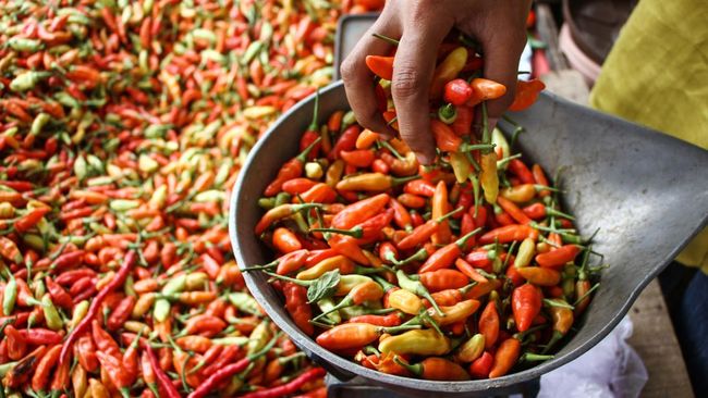 Ketiganya adalah cabai merah keriting yang turun dari Rp 66.250 menjadi Rp 63.750 per kilogram, cabai rawit hijau yang turun menjadi Rp 41.250 dari Rp 42.500, dan naiknya harga daging ayam ras segar menjadi Rp 39.250.